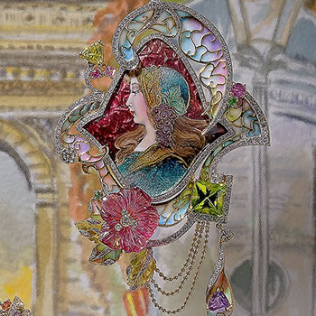 細密七宝ともいう七宝の一種です。七宝とは金属の素地にガラス質の釉薬を焼き付けた工芸品のことです。華やかな色彩で細密な図柄が描かれた七宝は明治時代、日本を代表する工芸品として海外に盛んに輸出されました。その技術を使用したものがこのエマーユジュエリーです。