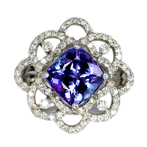 12月の誕生石です。灰簾石(かいれんせき)の中で、バナジウムを含むものをタンザナイトと言います。バナジウムは酸化の度合いで色合いが激しく変わるという性質を持っており2価が紫、3価が緑、4価が青、5価で無色を発色します。「ゾイサイト」の青色変色したものをタンザナイトといいます